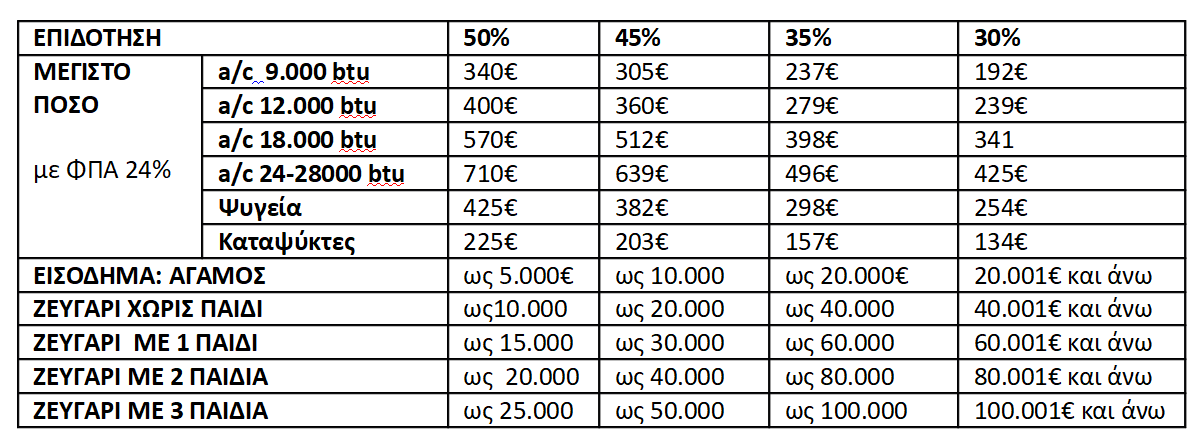 Το πρόγραμμα προβλέπει επιδότηση έως και κατά 50% η αγορά της νέας «πράσινης» συσκευής, ενώ τα ποσοστά και τα ποσά επιδοτήσεων διαμορφώνονται ανάλογα με το εισόδημα του δικαιούχου και τον τύπο της συσκευής.