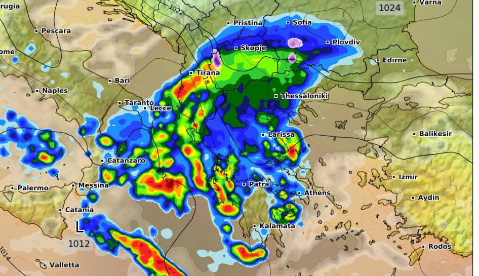 Παράλληλα, δορυφορικές εικόνες αποκαλύπτουν την παρουσία ισχυρού κυκλώνα πάνω από τα Βαλκάνια και το Αιγαίο, ο οποίος επιφέρει αστάθεια και ψυχρό καιρό σε τμήματα της Νότιας Ιταλίας.