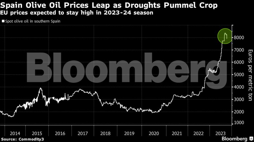 Σε συνδυασμό με τα σφιχτά αποθέματα, αυτό έχει ανεβάσει τις τιμές σε βασικές περιοχές καλλιέργειας, όπως η Jaen της Ισπανίας, σε επίπεδα ρεκόρ – και σχεδόν τριπλάσιες του μέσου όρου πενταετίας, σύμφωνα με το Bloomberg.